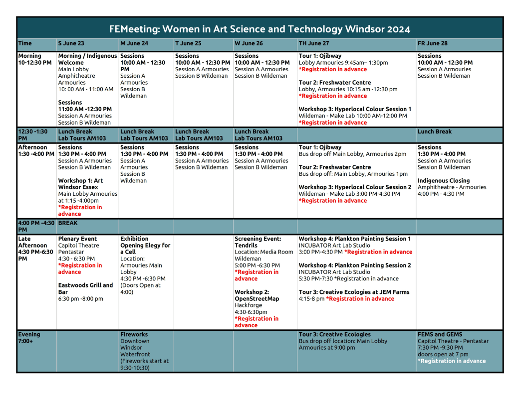 To facilitate personal networking, most of the program is organized as closed sessions, only for the conference speakers, but the program also includes two plenaries and two art events, open to the public that aim to encourage participation and attendance among all individuals interested in the topics of the conference independently of their gender. Due to the large number of participants, FEMeeting 2024 program will run in two parallel sessions (A&B) and to allow a further level of interaction among its speakers the organization has prepared a series of workshops and scientific tours available for a limited number of seats. All these events with the exception of plenaries, which takes place at the Capitol Theatre, will take place at the Armouries Building and at the Alan Wildeman Center for Creative Arts.